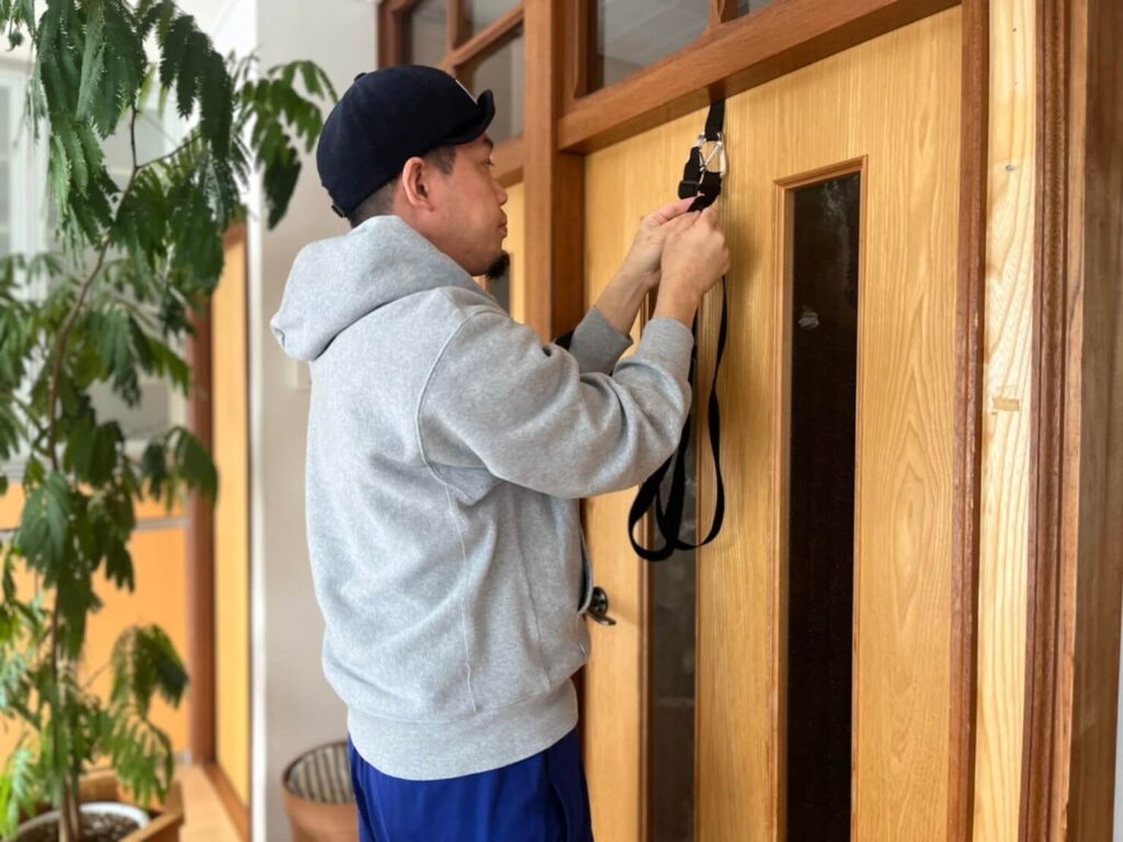 アンカー付きロープは自宅のドアに引っ掛けるだけで、誰でも気軽に使用できる器具です。